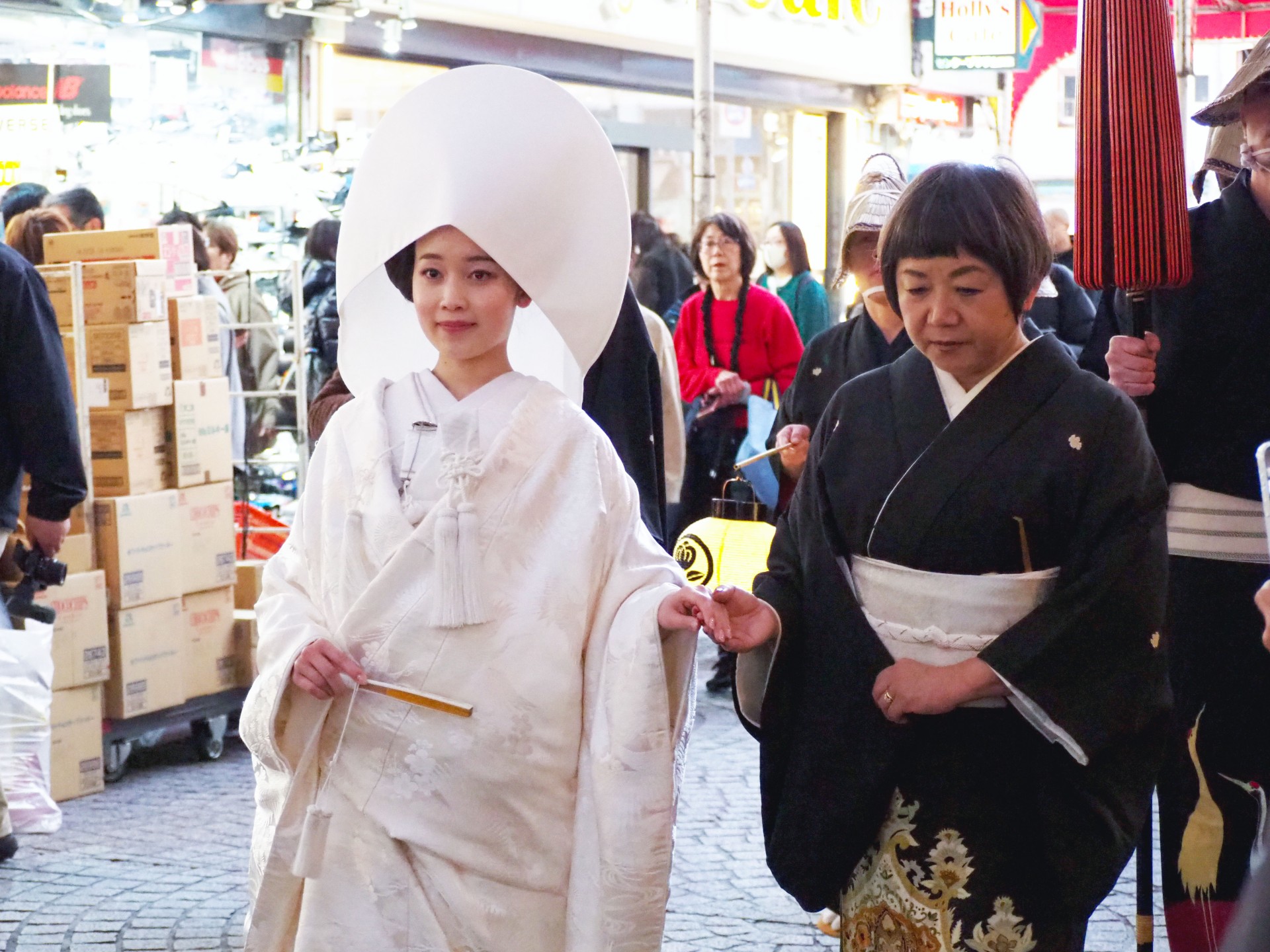 異国情緒が漂う神戸の街を舞台に、白無垢花嫁と黒留袖姿の参列者からなる行列一行の中、