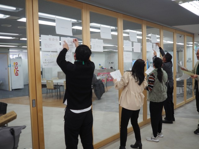 地元企業 株式会社いづよね、ジィ・アンド・ジィ株式会社、株式会社デジアラホールディングス、株式会社ネクストページ の4社と、大学生・専門学校生11名が参加。企業の採用プレゼンを聞いたり、キャリアデザインや働き方についてのワークショップを行いました。経営者と学生が直接意見交換することで、お互いの視野を広げることができました!